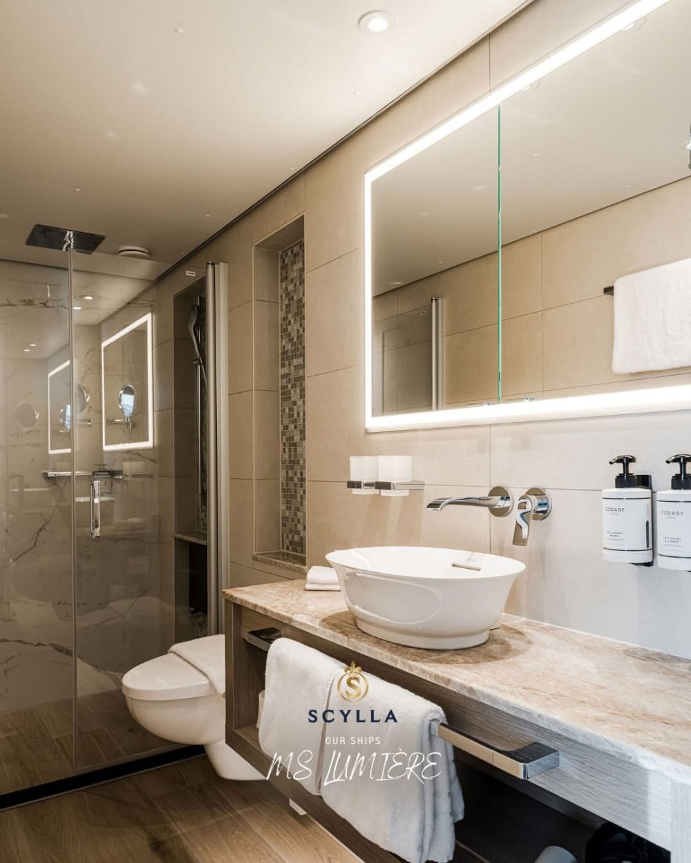 • There was mention earlier about the picture of the bathroom and the mirror. There is a different picture on the Scylla Facebook page that looks more like the bathroom we had on MS Grace. There are other different photos too
