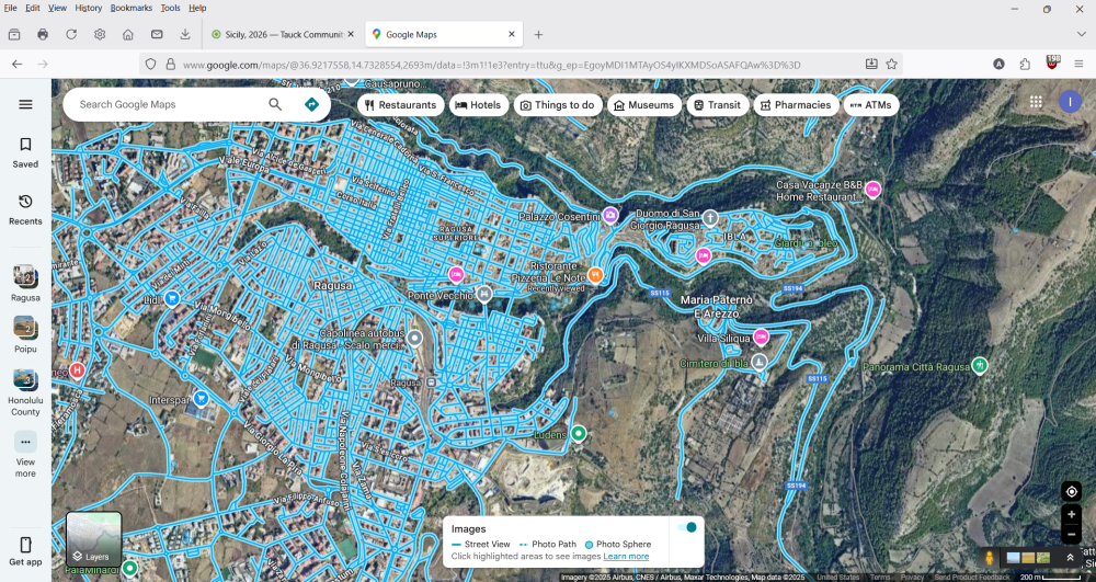 The light blue lines show the streets you can "walk" in Ragusa Ibla, Sicily using Google Maps Street View!!! (just zoom in a bit and drag the yellow walking man in the lower right, to where you want to start your stroll. Try it with your neighborhood and house.