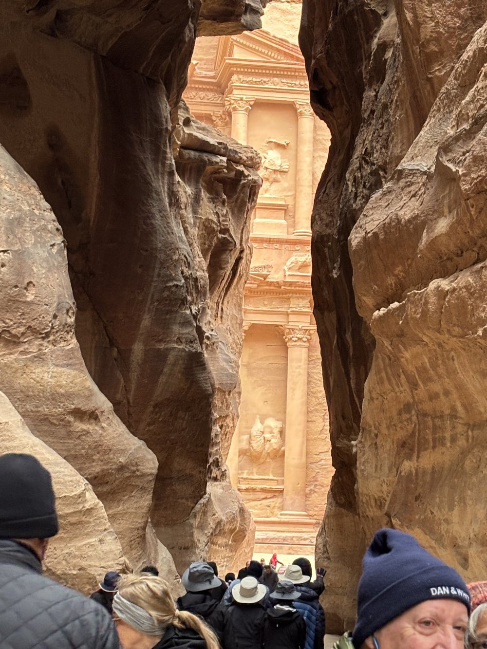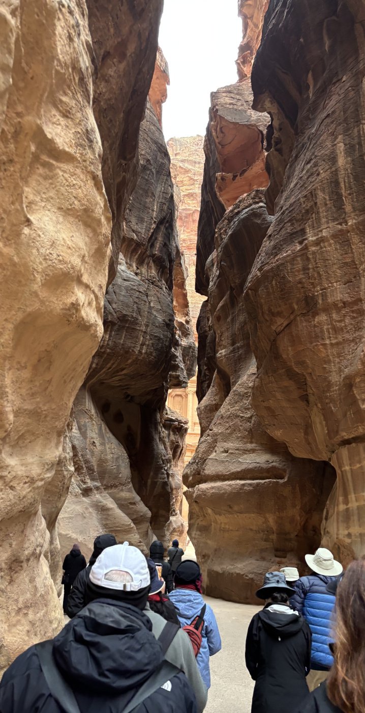 Thank you for your helpful comments everyone. Currently we are in Petra. Thus far the trip has been great. Our tour guide, Tony Oldham is soft spoken, organized and very visible. It is a large group of 37 people. He said this is the largest group that he has had since Covid. Jordan still only has 1/3 of the tourists that it had before Covid. We very much enjoyed the day tour that the concierge from the Kempinski arranged for us to the baptismal site of Jesus at Bethany, and old city ( Palestinian Camp) Amman. The tour does not take you at all through Amman, aside from going through on the highway. Everywhere we go we have an armed guard with us. In Jordan, they are called the tourist police. It is very useful to have someone like that with us because there are a lot of rules and they interact with the local police force. For example, yesterday it was pouring and our tourist police officer negotiated with the local police for our bus to pick us up right in front of the restaurant rather than us having to walk through the pouring rain back to the parking lot. It has been the same person the entire time, Kasim. Our local guide, Aziz, has been absolutely wonderful. He is full of all kinds of useful information, is funny, charming, and is fluent in English. He has traveled extensively throughout the states so he uses all kinds of American cultural references in his discussions. We had fabulous weather in Jerash, however, yesterday on our visit to Mount Nebo there was a deluge. In one day, we all got to experience 4 inches of rain, floods, roads closures, and then while we were driving to Petra we drove through a sandstorm. We managed to get the entire desert experience in one day. Today at Petra it was very cold, around 40° with wind gusts up to 27 mph. Everyone dressed appropriately and although there were some frozen toes and fingers, it really didn’t affect our good time. The pathways in Jerash and Petra, are fairly easy to walk on and do not require walking sticks. Actually, at Petra, on site, at the gate they offered us walking sticks to borrow if we needed them. Some people did avail themselves of this. For the most part, it was flat terrain with some very large Roman type cobblestone paving in areas. Petra is vast. To even get to the area where the famous treasury ( really a tomb) is requires a long walk through a slot canyon. This is about the halfway point. The walk today to where we had lunch was over 3 miles. Golf carts drove everyone back after lunch. If you wanted to stay at the site longer, you could, with golf carts available to take you back from the treasury Site all day long until 3 PM. The camel experience was essentially a single up, take a picture, then down on a camel in front of the treasury. Tomorrow Wadi Rum, which will also be cold. If you have the right clothes with you it is no big deal. I would advise monitoring the weather at different sites along the itinerary before you pack. So far only one business casual event - the welcome dinner. About to head to the Cave Bar. 😁
