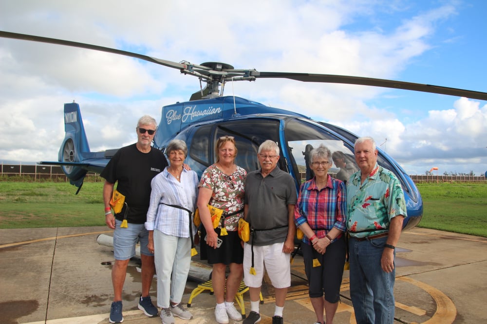 Just came back on Friday. Tauck will arrange to meet you at the airport with a lei greeting. Your Tauck Director will arrange the helicopter ride on Kauai. I think the name of the company is Blue Hawaiian but not sure. Any other helicopter ride on another island you have to book yourself.
